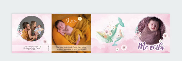 Avec ses trois volets, la forme en triptyque de ce modèle donne l’espace pour l’illustrer avec générosité ! Aux coloris rose poudré, il est idéal si vous souhaitez envoyer beaucoup de photos de votre petite fille à vos proches.
